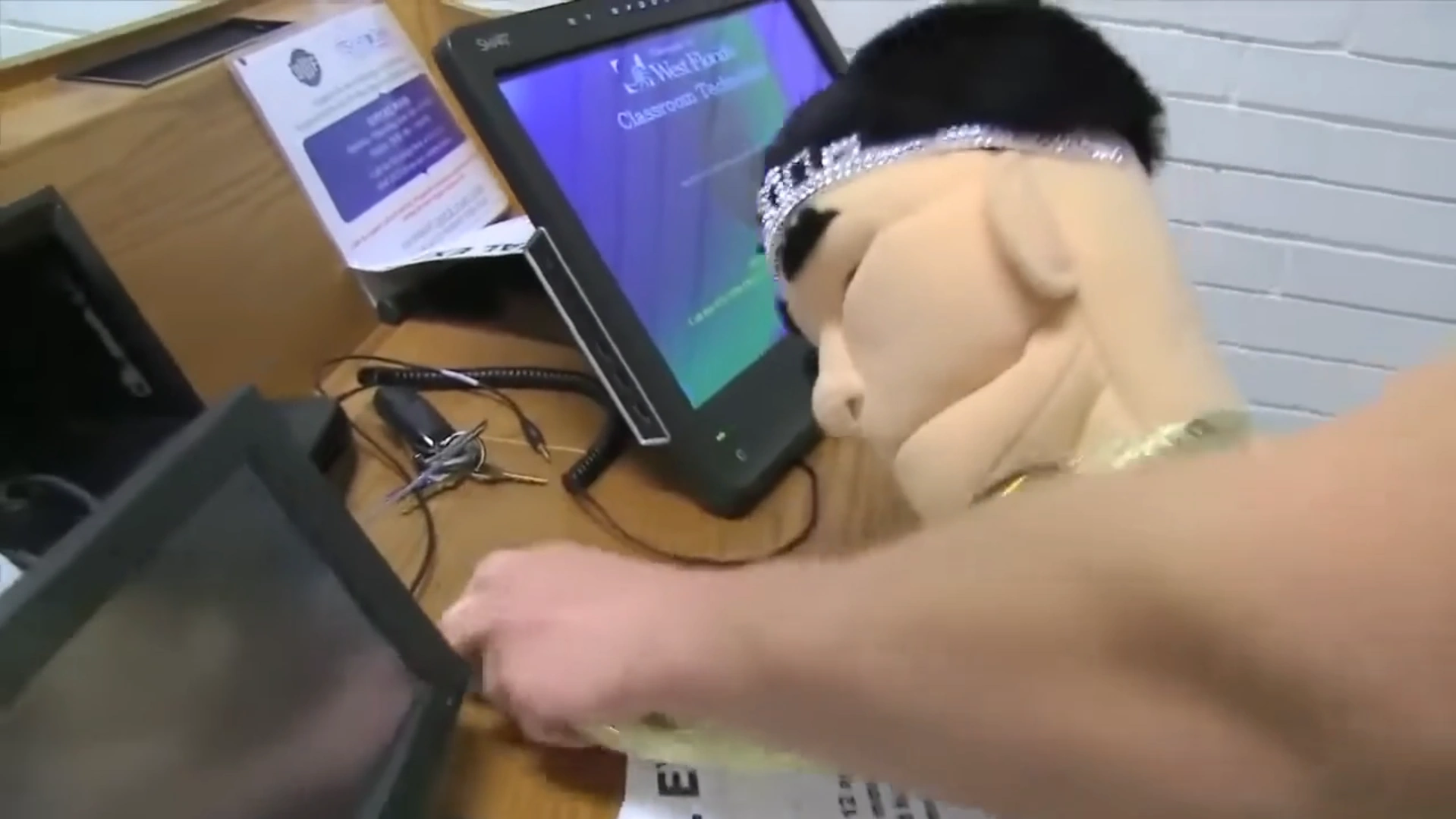 Jackie Chu picks up Tanner's paper-ball next to a monitor that has a University of West Florida wallpaper.