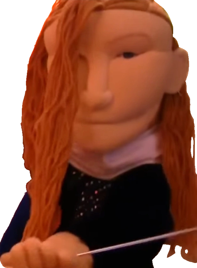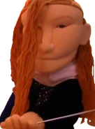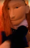 She has ginger hair and blue eyes and wears a black and white dress. She is portrayed by a Sunny Toys 28 Inch Queen Puppet with the hood down, additionally not wearing a crown.