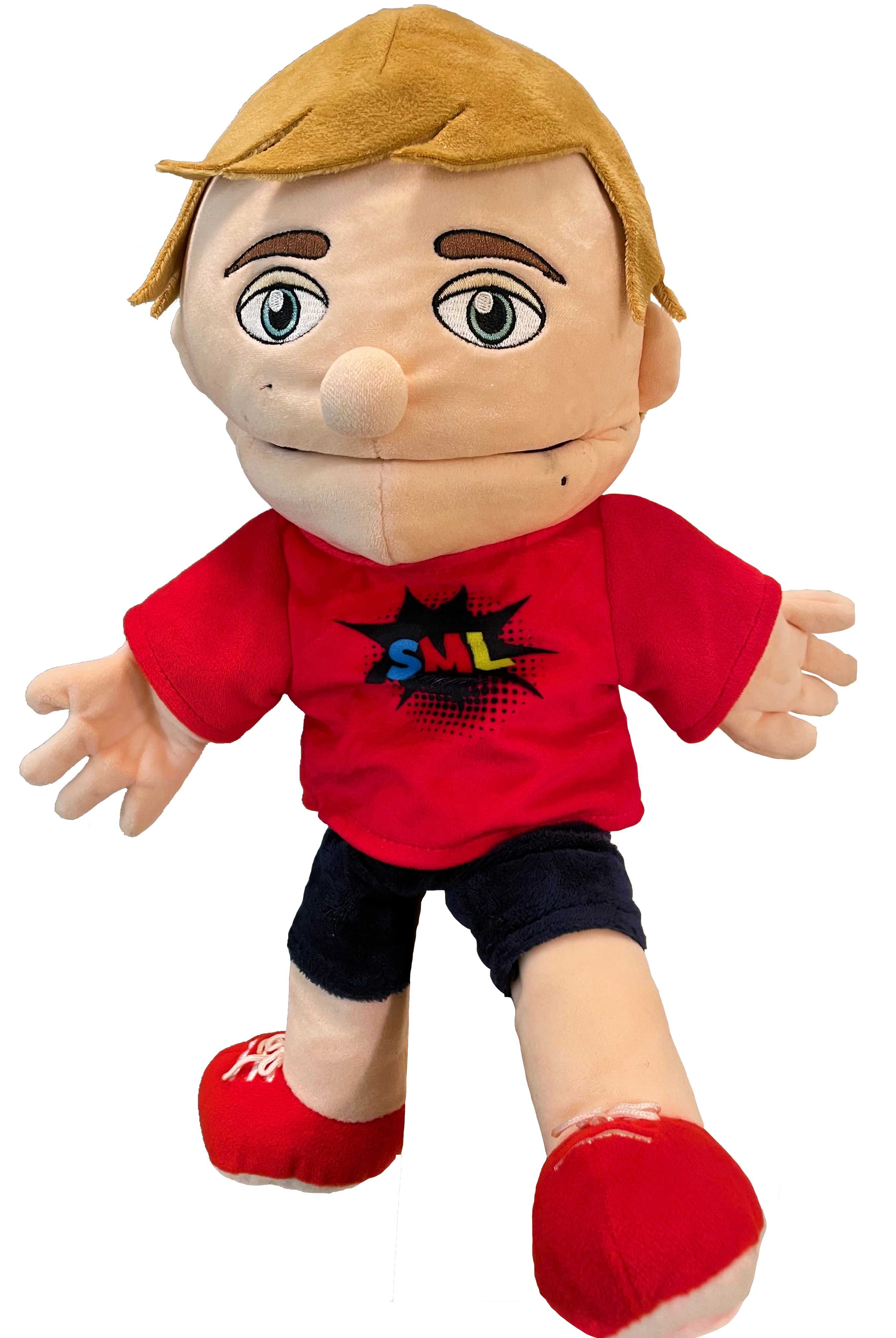 As of "Jeffy and Junior's Gold Play Button!", he looks more like Logan, with blond hair, brown eyebrows, blue eyes, and has a freckle below his left eye and lower lip. He also wears a red shirt with the SML logo on it, black shorts, and red and white sneakers.